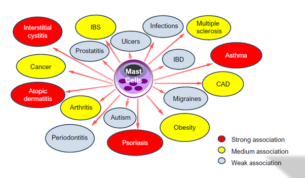 Mast cells are associated with many symptoms and pathologies (see Fig. 2) including type I hypersensitivity reactions, mastocytosis, mast cell activation syndrome (MAST), and urticaria, asthma and dermatitis (3).